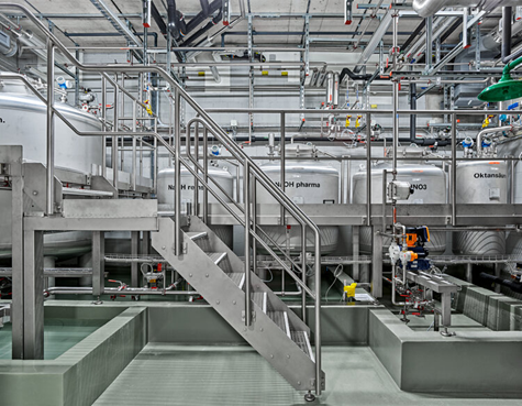 Die Zuführung der Prozess- und Reinigungschemikalien erfolgt ab dem bestehenden zentralen Chemikalienlager. Die acht verschiedenen Chemikalien werden in Tagesvorratsbehältern, welche im mehrstöckigen Gebäude im dritten Untergeschoss aufgestellt sind, vorgehalten. Von dort werden die Prozess- und Reinigungsanlagen in den Produktionsgeschossen versorgt.