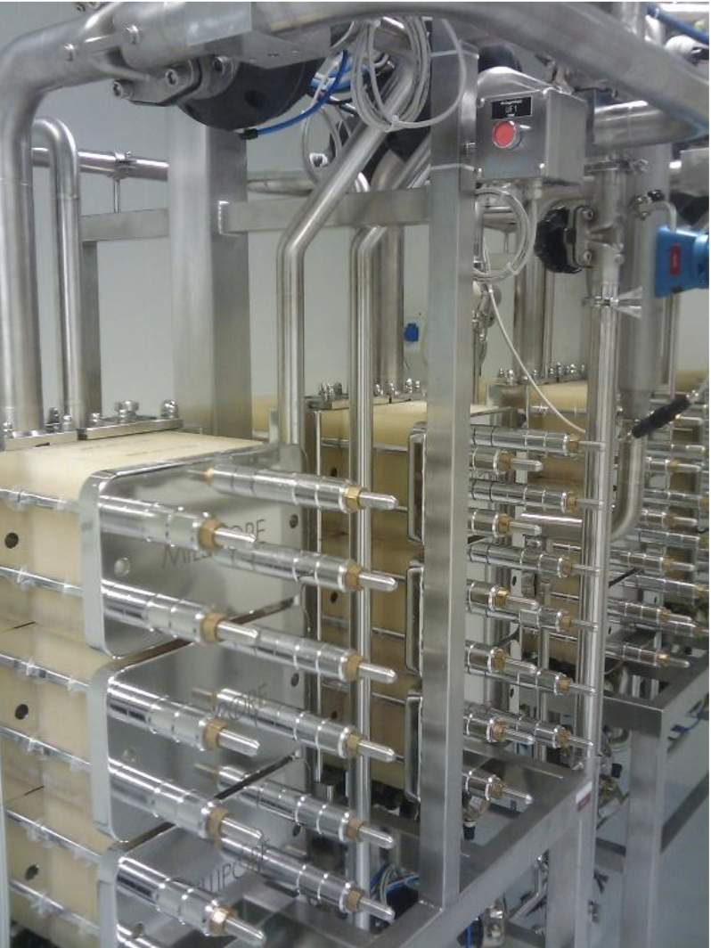 The units are designed as skid units and were delivered completely prefabricated. A maximum filtration area of 120m2 can be set up for large-volume processing of protein solutions. All equipment can be cleaned inline using CIP and sanitized using clean steam. The filter membranes are cleaned using a high-purity alkaline cleaning solution.